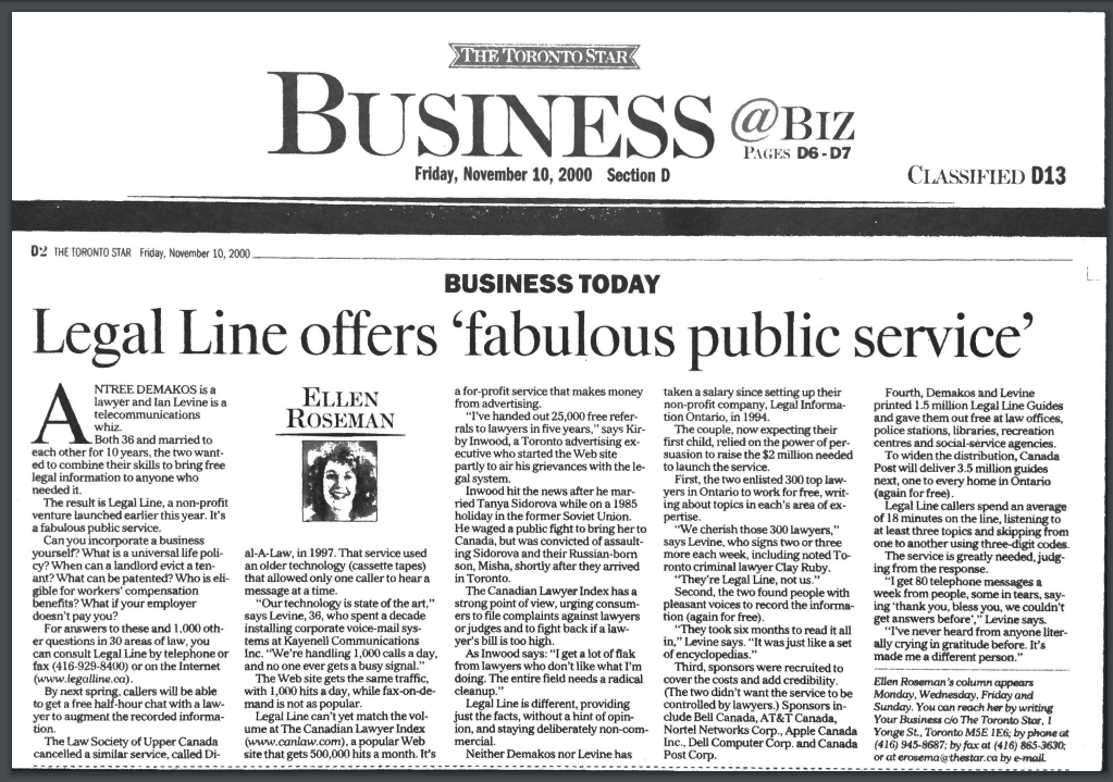 The Law Society of Ontario (LSO) links to the Founder of Legal Line, Dr. Antree C. Demakos as she is awarded a ‘TOP 10 Outstanding Lawyer’ in Ontario. The Law Society awards Legal Line Founder the 2018 John Shirley Denison Award for providing Canadians with a valuable Access to Justice website and Telephone Help-Line. The Law Society Award Celebration pictures and details. OUR 25 YEAR HISTORY WITH THE LAW SOCIETY   Dissolution of the Law Society’s Dial-a-law service With only 45 answers and an antiquated telecommunications system, the Law Society decided to cancel its failing Dial-a-law system. To fill…