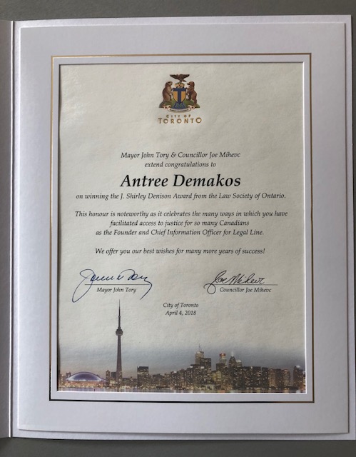 Ian Levine, Antree Demakos and Andreas Levine Antree’s 5 minute acceptance speech   On February 28, Treasurer Paul Schabas of The Law Society of Ontario announced that Antree Demakos had won the 2018 John Shirley Denison Award for her role as Founder and Chief Information Officer for Legal Line, which is responsible for helping 3 million Canadians a year with Free Legal Help. * (more pictures) Antree has had the support of Law Society Treasurers, including Harvey Strosberg (who at their delightful boardroom meeting applauded the Legal Line services and gave permission for the Law Society logo to be used…