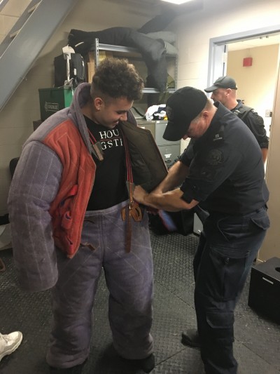 Andreas Levine gets suited up to play a suspect being subdued when Legal Line visited Toronto Police Dog Services (PDS) on July 30, 2020.