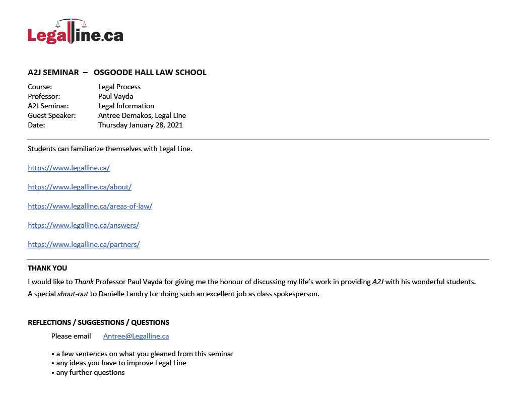 Legal Line’s Chief Information Officer, Dr. Antree Demakos, delivers a lively seminar to Osgoode Hall law students, outlining how Legal Line  removes barriers to justice and helps people to have direct access to the law.